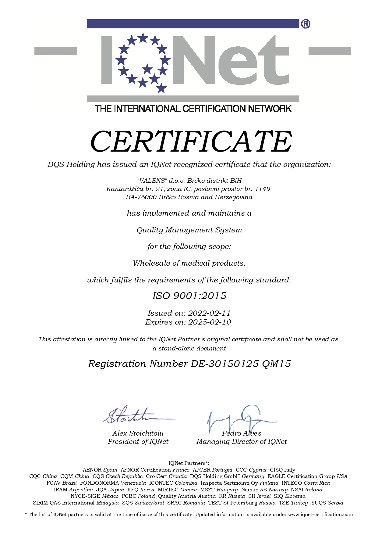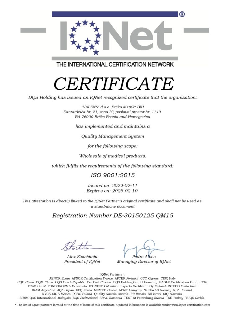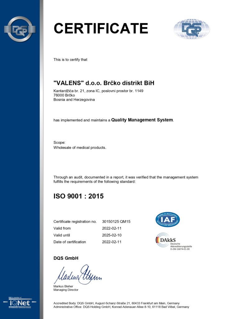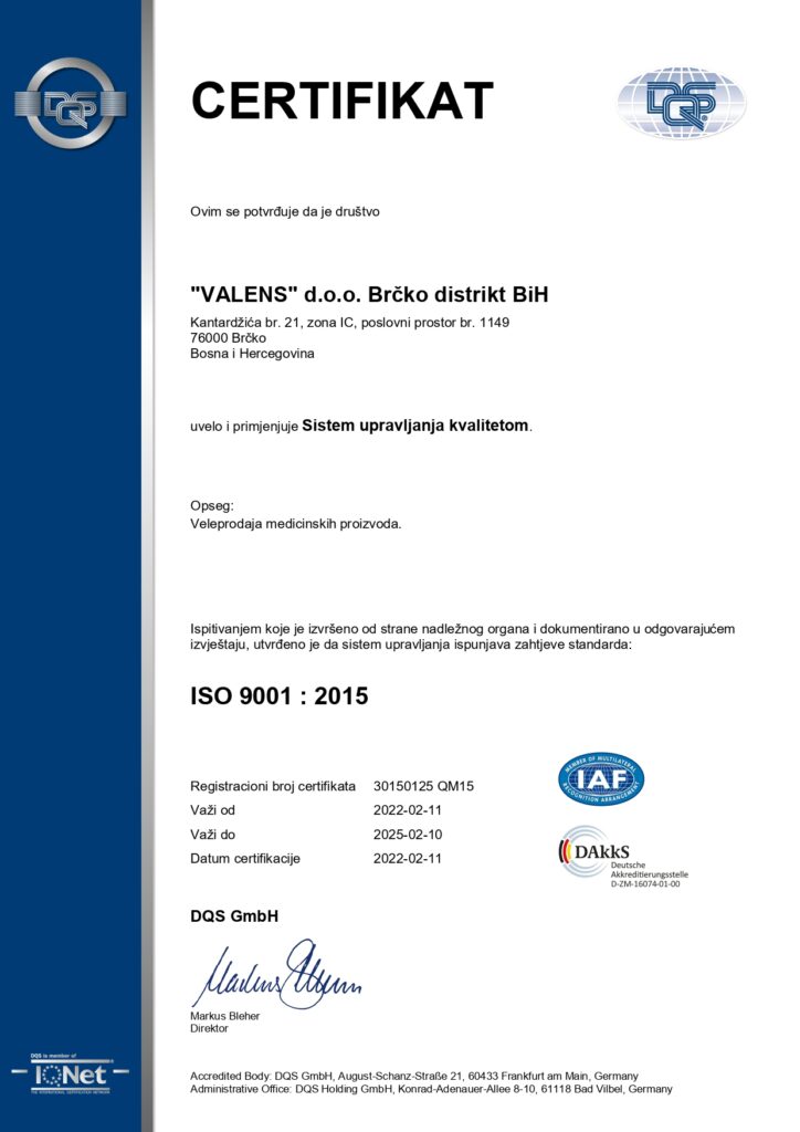 Firma Valens d.o.o. posjeduje ISO 9001 : 2015 certifikat za Sistem upravljanja kvalitetom, čime je potvrdila visoke standarde rada i poslovnosti.